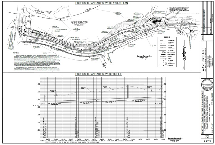 Wave Civil prepared construction documents for the replacement of existing 12” sanitary sewer main along Coal Landing Road in Stafford County, VA. Scope of work also included the preparation of sewer by-pass pumping plans, traffic control plans, erosion and sediment control plans, demolition of existing sewer main and associated construction specifications.