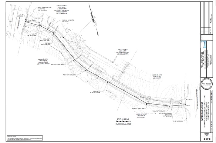 Wave Civil is currently in the process of finalizing the design for multiple water main extensions along Jewett Lane and Celebrate VA Parkway in Stafford County, VA. Scope of work included design of 12” and 16” water mains, traffic control plans, erosion and sediment control plans, pavement restoration plans, easements acquisitions, trenchless design and associated specifications.